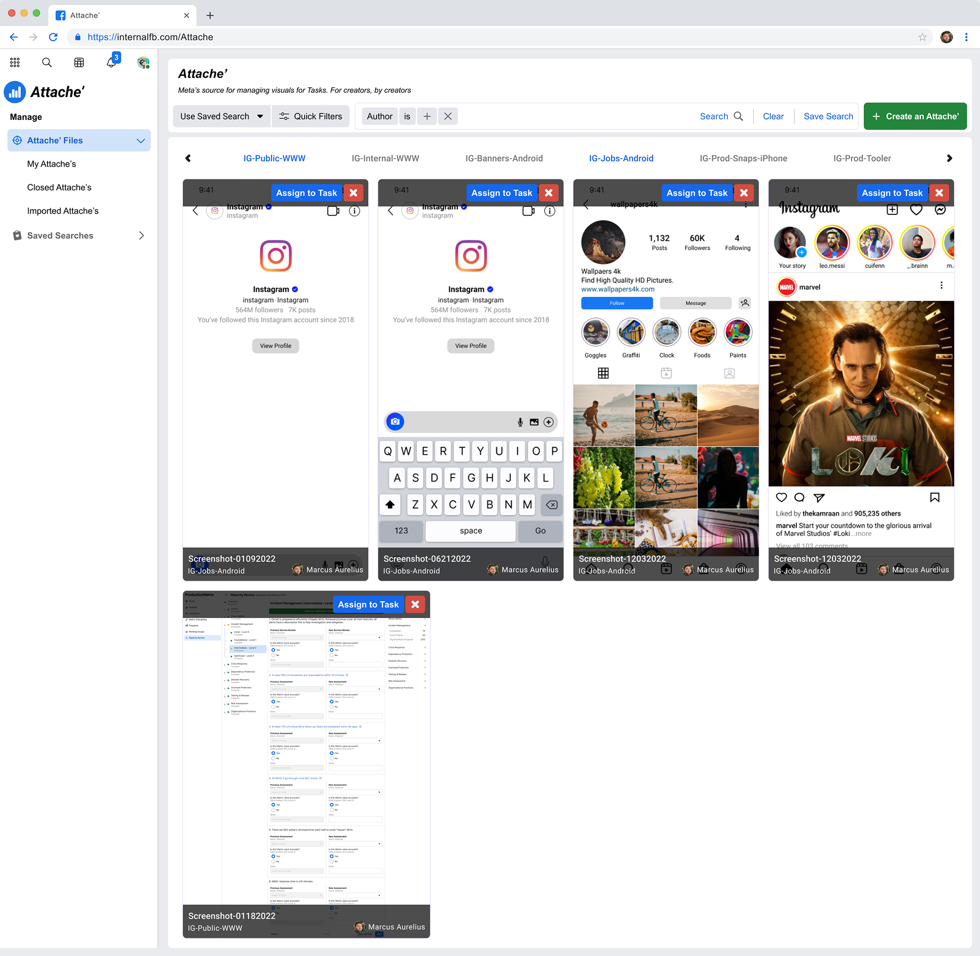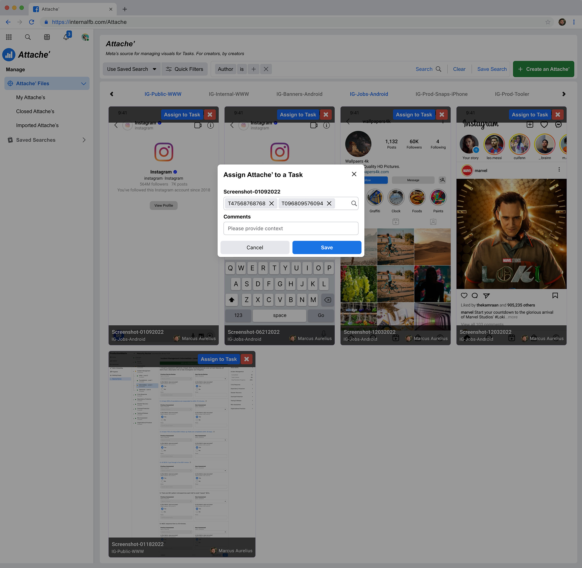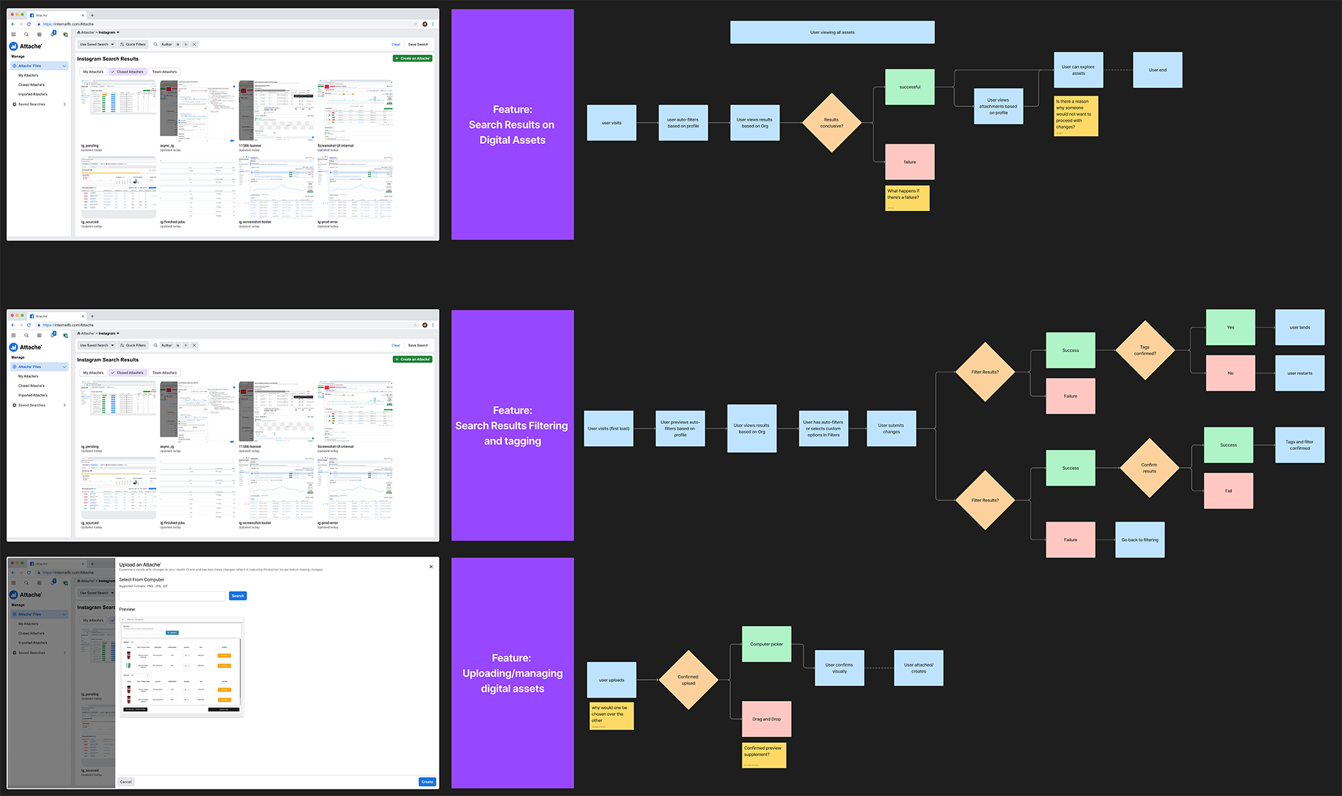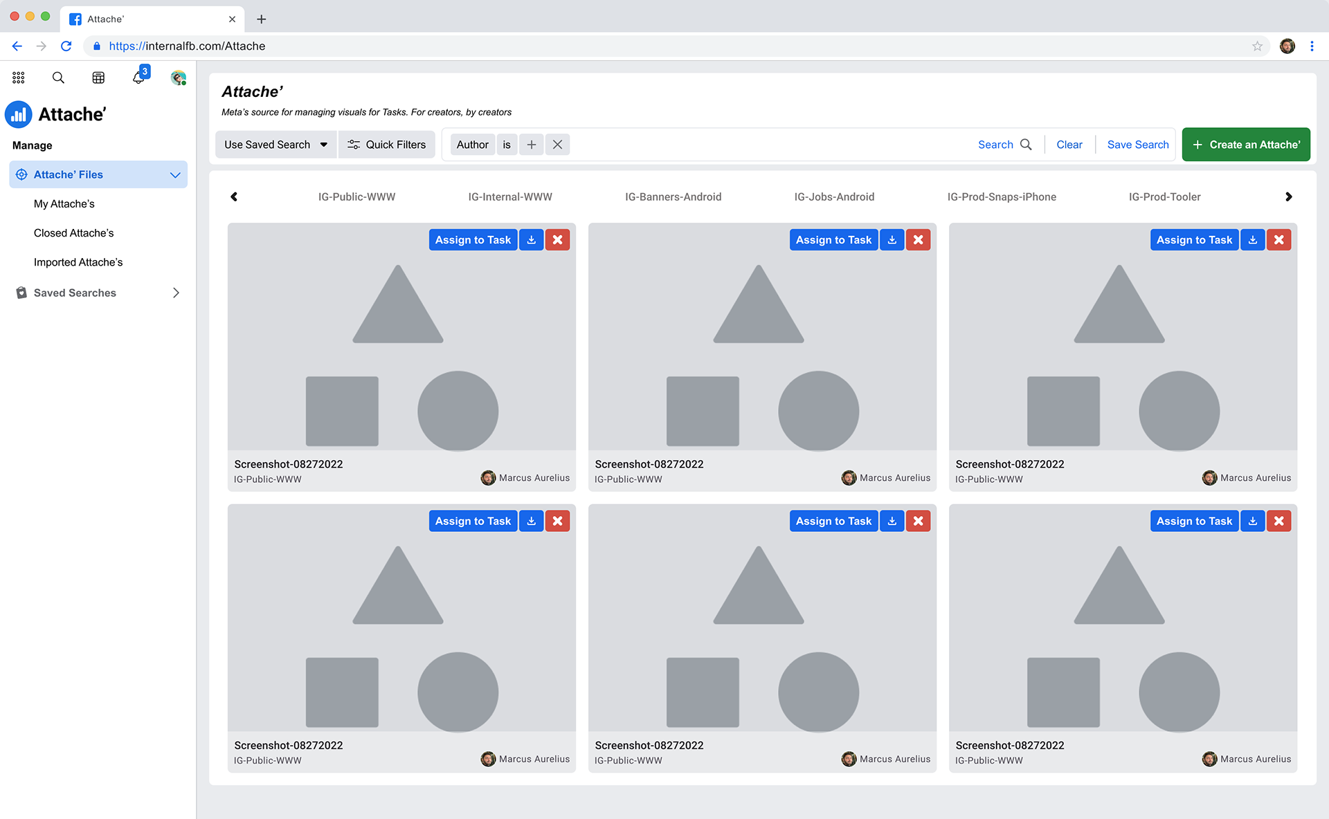 Wireframes surfaced actions on each Attache' (Assigning to a Task, Download, and Remove). The Name, Filtering tag and author were also overlaid onto the screenshot to minimize whitespace. Visual contrast risks were mitigated by including a background 50% differential to provide clarity.